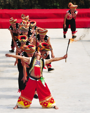 三江縣高基瑤族鄉(xiāng)的瑤族同胞表演傳統民俗吞火把