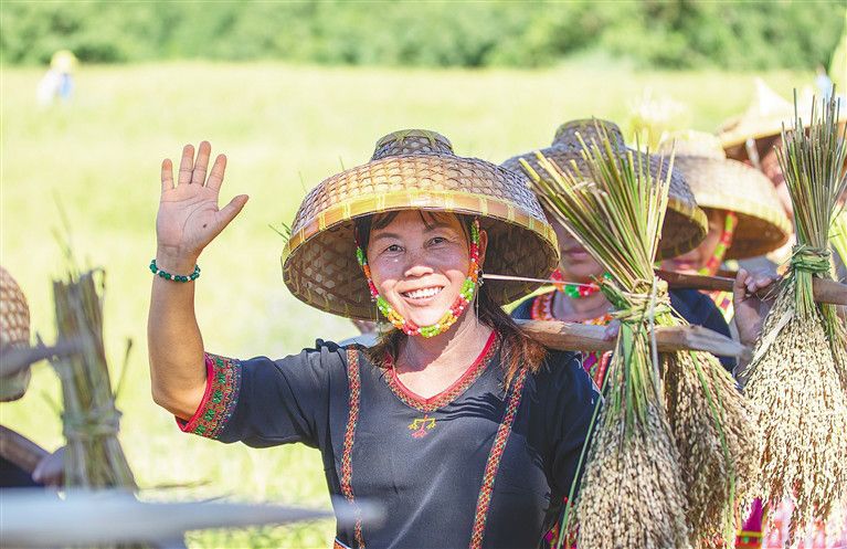 “砍山種植山蘭稻,一定要成功,煮好山蘭米,釀好山蘭酒,邀來親朋與好友,同慶好豐收……”當(dāng)天,在位于霸王嶺下的青松鄉(xiāng)擁處村的山坡上,一串串飽滿的稻穗已壓彎了稻稈;此時,農(nóng)戶們?nèi)褰Y(jié)伴爬上山坡,弓下腰身麻利地?fù)]動著手中的鉤刀開割稻稈,在辛勤勞作之時,還不忘哼起黎族歌謠分享著又是一年山蘭好收成的喜悅。山坡上辛勤勞作的喜悅,與正在山腳下舉辦的“啦奧門”山蘭文化節(jié)的喜慶氛圍達(dá)成了同一節(jié)拍。