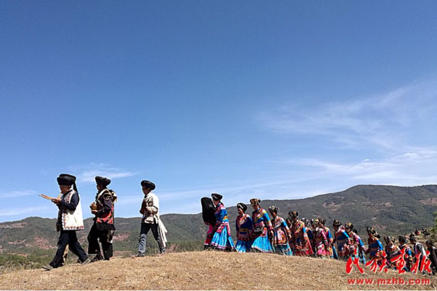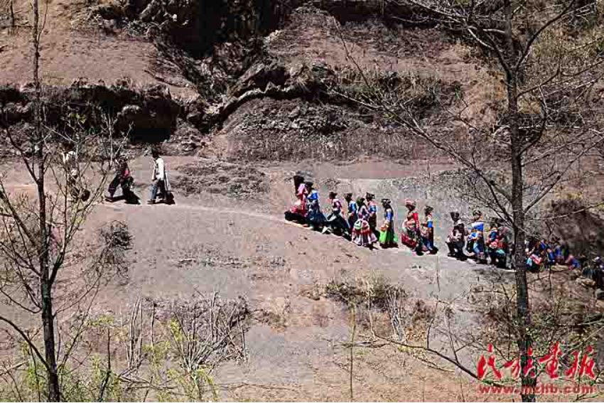 送親的隊(duì)伍走在崎嶇的山路上