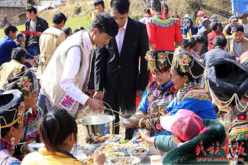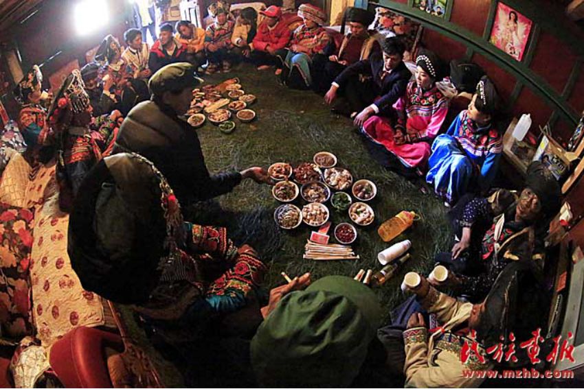 穿長衫,戴著包頭的新郎,把新娘接入正堂屋,將送親的人群迎進(jìn)臨時(shí)搭建的青棚屋休息。青棚,是傈僳族人辦婚事時(shí)砍來毛櫟樹、香樹枝等臨時(shí)搭起的棚子。既清新又涼爽舒適??梢杂脕斫哟e客,也可以作為跳舞、唱曲子的活動(dòng)場所。晚餐就在青棚里進(jìn)行,宴席一般不用桌子,酒菜擺在青棚下面鋪好青松毛的地上,客人八個(gè)一圈,席地坐在青松毛上,圍著喜筵,既歡樂又開心的喝著美酒、品嘗佳肴。晚飯菜肴十分豐盛,足見主人家的好客和廚師的高超手藝。菜出雙不出單,菜的顏色出紅不出白。一切都象征著成雙成對(duì),吉祥如意。