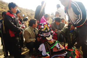彝族人接親,是通過(guò)“搶”的方式進(jìn)行的。接親者想早點(diǎn)兒背著新娘上婆家,而新娘的姐妹們則想讓新娘多留一會(huì)兒。當(dāng)接親者來(lái)?yè)屝履飼r(shí),圍在新娘身邊的姑娘們,把煙灰抹在手掌上,或拉著、或抱著、或追著去抹接親的人,那些接親者便一個(gè)個(gè)成為“黑花臉”,讓周圍的人們見(jiàn)了哄堂大笑。