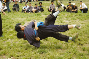 迎親宴畢,一般都要舉行摔跤比賽。先由女方家派人用酒邀請(qǐng),接親隊(duì)伍應(yīng)邀派出選手。在比賽中,只有把對(duì)方摔倒在地才算贏,如果雙方同時(shí)倒地,則比賽無(wú)效。