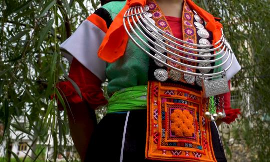 谷灑村女子服飾以短袖開(kāi)衫服飾為主,短袖開(kāi)衫服飾以綠色、橘黃色為主。谷灑村苗族背牌苗正是因?yàn)榕臃椛媳撑贫妹?。在女子服飾,短袖開(kāi)衫上必不可少的是背牌苗的背牌,背牌分為兩扇,后背牌較大,圖案以方形和字體為主。在前背牌系帶上同樣繡有圖案。背牌不僅是由刺繡圖案而成,還有銀飾。在背牌及系帶鑲嵌銀泡花。銀飾銀圈,銀圈的多少往往與女子家境有關(guān)。
