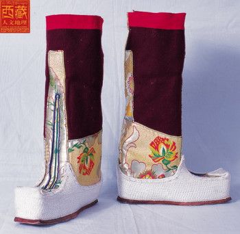 西藏高原地域遼闊,每個地區(qū)都有屬于自己的鞋子。藏族男女鞋,外觀雖然很像舞臺上古裝戲里穿的靴子,但用牛皮做底,底高二寸,腰高至小腿之上,鞋面用紅綠相間的毛呢裝飾,鞋腰也有線條、花紋,鞋幫用各色絲線或各色皮革、氆氌、金絲緞制成。人們能從一個人所穿的鞋子判斷出一個人的職業(yè)和社會階層。