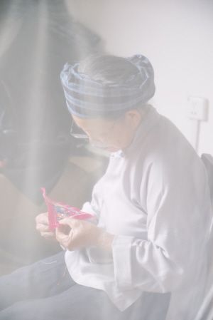 后來,我好幾天都到黃奶奶家,希望她可以染布給我看,但似乎總是機緣不到。一天,在黃奶奶家午睡醒來,隔著蚊帳,看見她側對著我正在繡花,沉浸在一片溫柔的光暈里。那是黃奶奶的另一項手藝,繡有龍鳳、獅子、蝴蝶、花朵、螃蟹這些吉祥花紋的繡片,會用在小孩背帶上,保佑他們健康長大。家里每個出生的成員都受到美和愛的環(huán)繞。