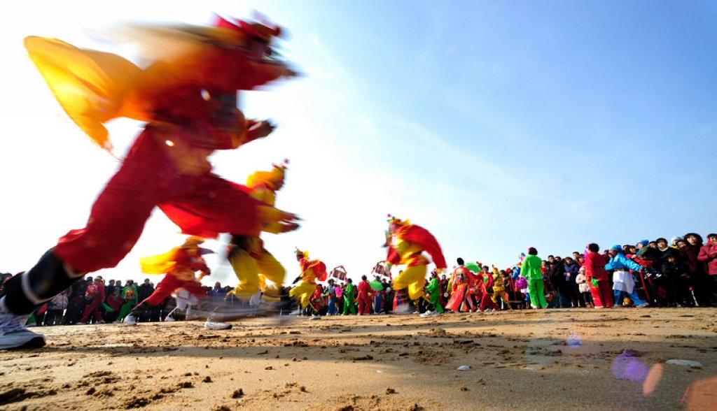 秧歌是春節(jié)群眾歡慶活動中,起著承前啟后、烘托氣氛的大型歌舞形式。這里所指的“秧歌”不僅是單一的“秧歌舞”,而是包含著數(shù)十種歌舞形式所組合的文藝演出隊伍。這支隊伍既要在走街串巷中做行進表演,又將最后集中于廣場做正式的歌舞演出。因此在北方,人們索性就把過去有著祭祀色彩,而今完全成為春節(jié)娛樂式的民間文藝形式稱為“社火”或“秧歌”,把這支浩蕩的隊伍統(tǒng)稱為“秧歌隊”。秧歌隊最前方,在高舉象征來年風(fēng)調(diào)雨順大傘的藝人率領(lǐng)下,“龍舞”“獅舞”舞隊位列隊首;接下來是一組手揮彩綢翩翩起舞,走“雙葫蘆”“繞菠花”各種圖案的“大場”表演隊;然后是腰間橫挎紅色腰鼓、踏著激越鼓聲的“腰鼓隊”,表演著令人眼花繚亂的“回頭望月”等套路;再后面是腰系竹馬或旱船,扮演新郎送媳婦回娘家的“跑驢”或“跑旱船”;接著是腳踩丈八高蹺、穿戲裝、彩繪臉譜的“高蹺隊”。接下來還有名為《火盆架子》的隊伍,那是把冬季用于取暖的炭盆架,用繩子將其高于腳面懸掛在肩上。盆架以綢布、花草裝飾,表演者戲裝打扮,表演一段段膾炙人口的戲曲節(jié)目。他們被歡天喜地、熙熙攘攘的人們擁簇著一同前往最后進行表演的廣場。由各個村鎮(zhèn)陸續(xù)舉行的這種熱烈而歡騰的歌舞慶祝形式,將貫穿在整個春節(jié)期間,直到正月十五“燈節(jié)”。