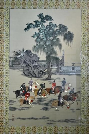 取材于后梁畫家趙喦所作《八達游春圖》。八人策馬揚鞭于草地間,前者呼,后者應(yīng)。絲縷排列精致細膩,人物五官不逾寸豆,卻被精巧的一一繡出,神情各異,極為傳神。