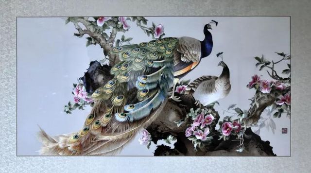 原作是畫家張玉明的工筆畫作品。一對孔雀棲息于爛漫盛開的山茶花間顧盼回首,相映成趣。整體繡面繡工精細、絲光迥動,將蘇繡精、細、雅、潔的特點表現(xiàn)得淋漓盡致。