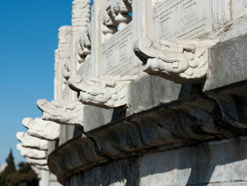 北京天壇祈年殿有三層月臺,第一層月臺上的排水構(gòu)件是云頭,第二層的是鳳頭,第三層則是龍頭,這個(gè)龍頭就是螭首(chī shǒu)。同樣,故宮太和殿龍鳳云紋的望柱下就有排水螭首1142只,可以想見當(dāng)大雨滂沱之時(shí),螭首千龍吐水是何等壯觀的場面。
