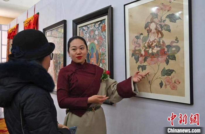 王天文是該協(xié)會(huì)為數(shù)不多的女性,自幼學(xué)習(xí)國(guó)畫。此次她的展出作品《花與佛》進(jìn)行了唐卡創(chuàng)新,將漢地工筆繪法的花卉與唐卡白度母形象融合。因?yàn)闊釔?ài)藏文化,2011年她從家鄉(xiāng)河北到西藏學(xué)習(xí)唐卡,希望能探索唐卡與不同繪畫種類方式的結(jié)合。