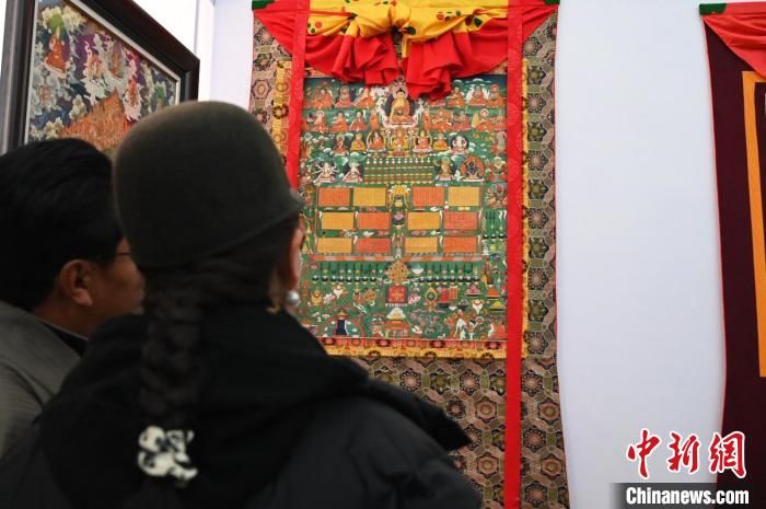 圖為唐卡愛(ài)好者欣賞唐卡展品?!≮w朗 攝