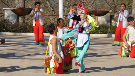 大三弦舞又叫“阿細(xì)跳月”,流傳于云南撒尼和阿細(xì)民間的一種舞蹈。據(jù)傳大三弦舞來源于刀耕火種時代。跳這種舞時,男子一字排開,彈著三弦或吹著笛子跳。隨著節(jié)奏抬腳踢腿,向前退后、向左向右交換舞步。女青年亦一字排開,腿上的動作與男青年一致。不同的是女青年要拍手,原地跳一段節(jié)奏,由左向右轉(zhuǎn)一個圈,輪回反復(fù)。有時男子向前沖,女子向后退,富有情趣。