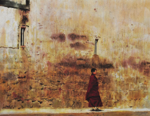 在麗江的束河古鎮(zhèn),他坐在小溪邊,吹著清涼的微風(fēng),聽著對(duì)面咖啡屋傳來的低吟慢唱,心情舒暢地畫著自己的畫。很快,一幅《水邊咖啡屋》就在這不經(jīng)意間誕生了。在梅里雪山,早晚都能看到人們所說的日照金山的美景,打開窗戶,暖陽透進(jìn)來照在身上,就這樣畫著藏族人心中的神山,他覺得實(shí)在找不出還有比那一刻更美好的感覺了。