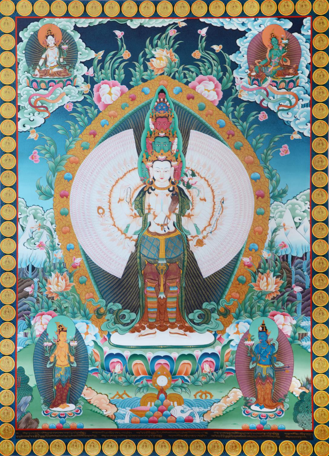 "千手觀音"全稱"千手千眼觀世音菩薩",又稱"千眼千臂觀世音菩薩",是佛教六觀音之一。 佛教認(rèn)為,眾生的苦難和煩惱多種多樣,眾生的需求和愿望不盡相同,因此,就應(yīng)有眾多的無邊法力和智慧去度濟(jì)眾生。據(jù)《千手千眼觀世音菩薩廣大圓滿無礙大悲心陀羅尼經(jīng)》說,觀世音菩薩在過去無量劫,聽千光王靜住如來講《廣大圓滿無礙大悲心陀羅尼經(jīng)》時,為利益一切眾生,"即發(fā)誓言,若我當(dāng)來堪能利益安樂一切眾生者,令我即時身千手千眼具足","發(fā)誓愿已,應(yīng)時身千手千眼悉皆具足",變現(xiàn)出如意寶珠、日精摩尼寶珠、葡萄手、甘露手、白佛手、楊柳枝手等。無論眾生是想渴求財富,還是想消災(zāi)免病,千手觀音都能大發(fā)慈悲,解除諸般苦難,廣施百般利樂。在佛教看來,只要虔誠地信奉千手觀音,就有"息災(zāi)","增益","敬愛","降伏"等四大好處。