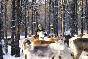 人類馴養(yǎng)馴鹿的歷史有1000多年。這是一種異常勇敢的生靈,生活在北極圈附近,分布在歐亞和北美大陸及一些大型島嶼。在極度惡劣的自然條件下,馴鹿為了繁育后代,每年都要冒著生命危險長途跋涉數(shù)百里,其堅韌不拔的意志力和不屈不撓的品格正是北極冰原精神的象征。在中國,馴鹿棲息在大興安嶺北段的寒溫帶針葉林中,處于半野生狀態(tài),這里有激流河、阿穆爾河、阿巴河、呼瑪河,有阿龍山、奧克里堆山等。食物主要是苔蘚,也吃石蕊、蘑菇及大木植物的嫩枝葉。鄂溫克族的祖先把鹿視為圣潔,賦予其許多美麗的神話和傳說。是啊,只要有了馴鹿,鄂溫克人便是幸福的。據(jù)考證, 我國的馴鹿與貝加爾湖東北部尼布楚河上游溫多苔原高地的馴鹿有淵源關(guān)系。可以說,鄂溫克人的馴鹿、狩獵、樺皮文化、薩滿教把北極文化延伸到了興安嶺。