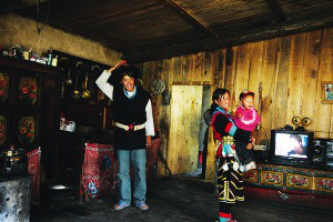 在珞巴族家中,男主外,女主內,分工相當明確。當達瓦在家里和我聊天時,他的妻子群宗一直在忙碌著,忙著給我打酥油茶,忙著生火燒水、煮土豆,忙著照顧孩子。為了讓我能拍一張達瓦一家人穿珞巴族服裝的照片,大家費了好大勁兒。他們從東家借來帽子,從西家找來褂子,也有從南家借來的飾品……終于,達瓦和群宗夫妻倆都穿戴上了本民族的服飾,我如愿以償?shù)亟o他們拍了一張全家福。