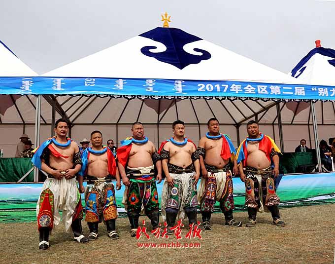 巴音昌呼格草原舉行。圖為被授予“將嘎”(彩帶)的鄂爾多斯搏克們
