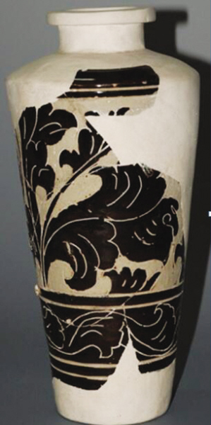 褐釉剔刻花葉紋經瓶,高31厘米、口徑8.5厘米、底徑9厘米,二級文物。三組雙弦紋將腹部分為三部分,上部剔刻折枝花葉紋,葉片肥碩,左右舒展。其下刻劃一周卷葉紋,其下光素。內外施褐色釉。殘存腹部一半,其余為后修復。