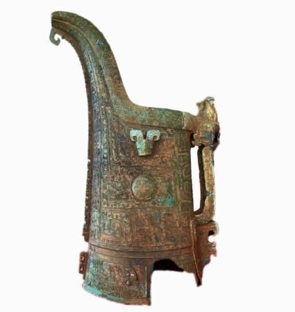 出土?xí)r,銅觥側(cè)置平放,銅壺倒置于銅觥內(nèi)。銅觥重13.45千克,器身呈扁圓形??脊艑<曳Q,該銅觥器形獨(dú)特,如突出眼睛的變形獸面紋、“C”形扉棱、羊角騰空設(shè)計的平嘴犧首等,與以尊、罍為代表的殷墟時期南方特征青銅器相一致。