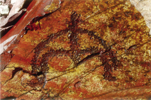 彩繪巖畫作為南系巖畫的主要代表類型,在寧夏境內(nèi)并不多見,僅在石嘴山白芨溝的一處坐北朝南的天然洞窟中發(fā)現(xiàn),巖洞敞開,可容納數(shù)百人。被發(fā)現(xiàn)的彩繪巖畫分布在高8米、長10米的崖壁上,坐西向東,以赭石顏料涂繪,有24組42幅精美的巖畫,內(nèi)容包括狩獵、騎者、牧歸,以及牛、羊、馬、狗等動物。這些罕見的彩繪巖畫時至今日依然是“養(yǎng)在深閨人未識”,更讓人擔心的是隨著環(huán)境污染造成的自然破壞已經(jīng)讓這些彩繪巖畫顏色發(fā)白,亟待引起重視,加以保護。