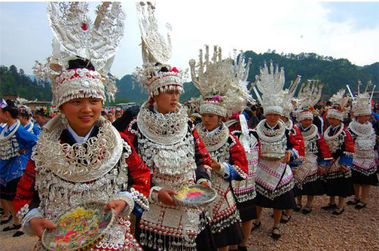 銀飾作為苗族最喜愛的傳統(tǒng)飾物,主要用于婦女的裝飾,品種多樣,分為頭飾、面飾、頸飾、肩飾、胸飾、腰飾、臂飾、腳飾、手飾等,彼此配合,體現(xiàn)出完美的整體裝飾效果。苗族銀飾常出現(xiàn)于苗族的喜慶場合,蘊(yùn)涵有避邪趨正、納福迎祥的寓意,具體生動(dòng)地反映著苗族人民的生存狀況、精神面貌和審美心理,具有很高的歷史文化研究價(jià)值。在對外交往中,苗族人民把銀飾作為禮品贈(zèng)送友人,和藏族的哈達(dá)、漢族的珠寶一樣珍貴。