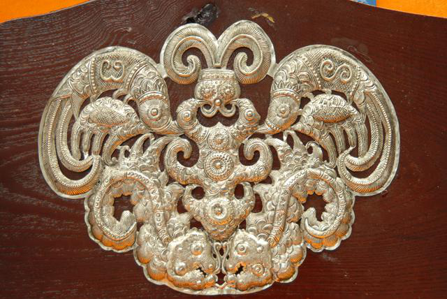 流傳于劍河境內(nèi)的苗族銀飾通常以龍、虎、昆蟲、花鳥等動(dòng)植物圖案為基本素材,加上鏈狀絞花、鏨花、壓花、編花相互配合,精美中透著靈氣。劍河苗族銀飾根據(jù)造型不同,分為三個(gè)片區(qū):革東片區(qū)的項(xiàng)圈為鏈狀絞花式;南寨片區(qū)的項(xiàng)圈為板圈式;久仰片區(qū)為橫板頭式。
