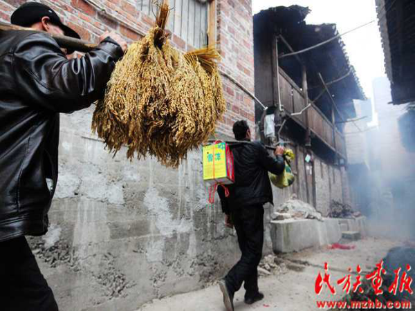 賀禮是街坊鄰居送給新娘家的禮品,在婚禮結(jié)束后的第一天下午進(jìn)行。送賀禮由中老年婦女承擔(dān),送時或單獨或結(jié)伴而行,禮品或手提或裝在竹筐里,一般都要帶上若干份,每戶一份,一次送完。禮品送到新娘家后,新娘家要進(jìn)行登記并送幾塊餅干糖果以表謝意。