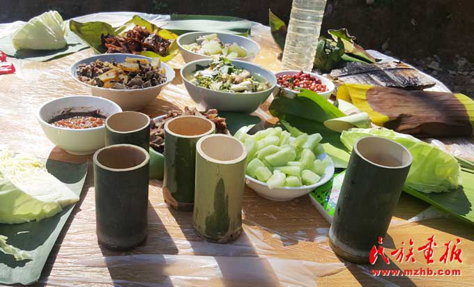 基諾族地區(qū)食材豐富,一日三餐,以大米為日常主食,雜以玉米、瓜豆等。每年5—9月的雨季,基諾山漫山遍野是食材,山藥、水芹菜、竹筍、魚腥草及各種菌類等無污染且很新鮮,是難得的烹飪材料,經過簡單處理就成為餐桌上的美味佳肴?;Z族民間有句俗話,叫“漢炒、傣蘸、基諾舂”,也就是說漢族人喜歡吃炒菜,傣族的菜喜歡蘸著調料吃,基諾族的菜則以臼舂為主。基諾族的肉類的吃法較多,可以腌成干巴,也可吃新鮮的。酸腌魚、涼拌茶也是基諾族的最愛,基諾人做飯就餐均在竹樓二層的火塘周圍進行,有一定的禮節(jié)和講究?;Z族吃飯時,主人首先要在火塘東側獻一點飯菜祭祀祖先和灶神,吃飯時全家人按順序在火塘旁圍蔑桌而坐,家長正對火塘,客人靠火塘而坐。