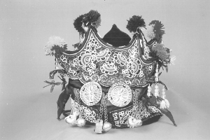 繡花帽由里外兩部分組成,素有“制做繡花帽,先做好襯套”之說(shuō)。即先按兒童頭徑大小制襯套,做法較簡(jiǎn)單,用染過(guò)的家織布做里襯,鋪上薄棉,外層為紅綢面,用線依次納緊,以防棉花下滑,縫成筒狀后,頂部用同樣的材料剪成四方形,與上部帽沿結(jié)構(gòu)相同即成。后部分較前部分復(fù)雜,先將染過(guò)的兩層家織布粘牢,表面貼上各色緞面,顏色自定。把圖樣拓在緞面上,剪下形狀不同的6片材料,把喜愛(ài)的圖案描繪在上面,接著用紡車紡出6根各4米長(zhǎng)的棉線,用吊砣逐根旋轉(zhuǎn)纏繞白色呢絨線,經(jīng)濃縮,每根僅得到1米左右線料,將這制好的精線按圖案盤(pán)弄,后以花針固定,再輔以其他色線刺繡成圖案點(diǎn)綴其間。把繡好的6片材料組合到襯套上,各片邊沿用黑白兩色線交替鎖邊,帽口用黑金絨布滾邊。此時(shí),帽頂?shù)模吨患饨怯貌噬€制做成圓球裝飾,外面四角下面懸吊白色珍珠串,末端垂著布制五角星。帽的周邊釘上銀制品,最后鑲上反光小圓點(diǎn)飾物似天上星星般光亮,給本就精致美觀的繡花帽增添了一道靚麗色彩,繡花帽就這樣在侗家女的手中誕生了。