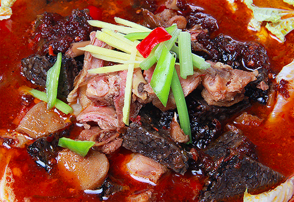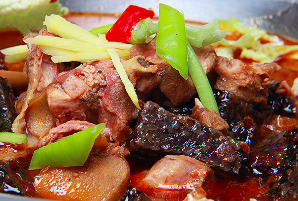3、大約燉至90分鐘左右后,肉熟骨爛把已炸好的血粑及新鮮紅辣椒一起倒入鴨肉內(nèi),再用高火燉5至10分鐘,即可食用。