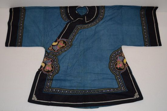 分布在凱里、雷山、丹寨、麻江四縣交界地一帶苗族村寨,以凱里舟溪苗族為代表。該服裝上衣為緞面對襟衣,刺繡主要在肩袖及袖口部分,以黔東南苗族特有的繭片繡為主,所繡圖案為浮萍花和幾何紋,肩部和背部鑲有銀泡和銀片,具有民族特點 。前、后圍腰片均以繭片繡為主,所繡圖案為浮萍花和幾何紋。