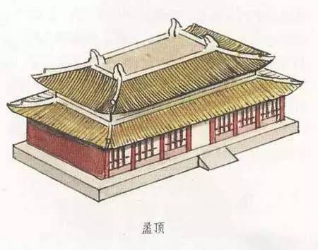 盝頂,是一種較為特別的屋頂形式。這種屋頂形式是在屋頂上有四條與屋檐平行的屋脊,四條屋脊構(gòu)成一個(gè)長方形或正方形的平頂,其四角各有一條垂脊向下斜伸,共形成四塊坡檐。盝頂這種頂式在古代大型宮殿建筑中極為少見。