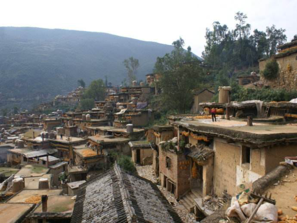 彝族是農(nóng)牧兼營的民族,村寨的分布與坐落有其獨(dú)特的傳承。彝族的村寨多坐落在海拔2000~3000米的山區(qū)、半山區(qū),相沿聚族而居。為適應(yīng)西南地區(qū)亞熱帶氣候和山地特點(diǎn),彝民們便就地取材,以一種最容易、最節(jié)省錢財(cái)人力的建房方式,創(chuàng)造出中國建筑的獨(dú)特樣式——土掌房。土掌房多建于山地斜坡上,以石為墻基,用土坯砌墻或用土筑墻,墻上架梁,梁上鋪木板、木條或竹子,上面再鋪一層土,經(jīng)灑水抿捶,形成平臺(tái)房頂,不漏雨水。有的大梁架在木柱上,擔(dān)上墊木,鋪茅草或稻草,草上覆蓋稀泥,再放細(xì)土捶實(shí)而成。