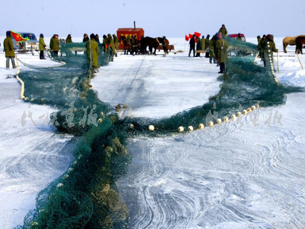 隨著“魚把頭”高亢的號子,馬拉人拽,一張幾千米長的大網(wǎng),被緩緩地拉出冰面。鯉魚、鯽魚、鰱魚、鯰魚等各種魚類一群一群翻上了冰眼。轉(zhuǎn)眼之間,冰面上堆起了一個個魚垛。
