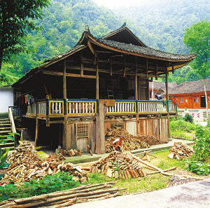 在湘西、鄂西的武陵大山里,土家族居住的轉(zhuǎn)角吊腳樓特別適合那里坡陡谷深、千溝萬壑的地勢地貌,已成為土家族標(biāo)志性的民居建筑。歸納起來,轉(zhuǎn)角吊腳樓依地勢和財力主要有單吊、雙吊、四合水、平地起吊等形式。因為建房時只平整正房的屋基,將正房完全建在實地上,廂房與正房相接的一邊靠實地,其余三面懸空。因廂房與正房直角相連,又是干欄式的構(gòu)造,故稱“轉(zhuǎn)角吊腳樓”。