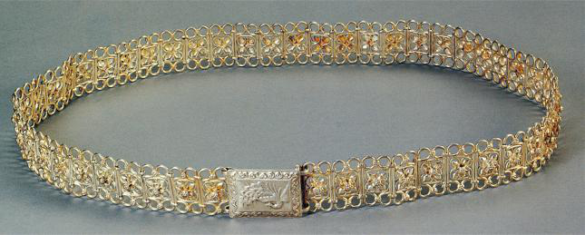 傣族銀腰帶傣族婦女喜歡帶手鐲、戒指、耳墜、項鏈等,這些物飾金質(zhì)、銀質(zhì)、玉石均可,仿制品也行。女嬰生下來幾天,就由家長用消過毒的針為娃娃扎耳,為帶耳環(huán)作準(zhǔn)備。對女性而言,銀腰帶更是不可缺少之物,腰帶上飾以孔雀、蓮花等各種花型。女人們認(rèn)為銀腰帶越寬就越美(圖為傣族銀腰帶,以上圖片為中央民族大學(xué)博物館館藏)。
