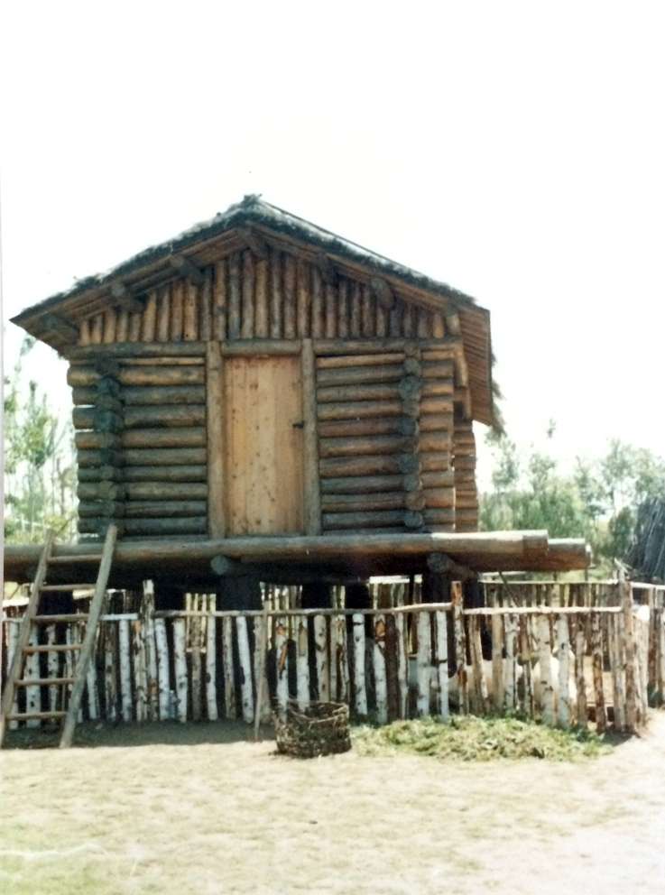 早期,每一個家族公社都有一個公用的高腳倉庫,鄂倫春語叫“歐倫”,一般是在游獵的中心地帶,選擇四棵自然生長、成對角的樹,在距地面約3—4米高的地方留一個樹杈,砍掉其余的樹頭,樹杈上架兩根直樹干,樹干上面一根挨一根地平鋪木桿成為底座,底座上用木桿壘一個“木刻楞”小房或用樹枝做一個半圓形的架子,覆蓋樺樹皮,然后用藤條或樹皮綁縛固定。一側(cè)留有進(jìn)出的小門,借助木梯上下,為防止野獸攀上糟蹋東西,平時都把木梯放倒在一邊。這種倉庫主要存放一些暫時吃不了和用不著的食品和雜物,搬遷時不拆除,里面的東西也不帶走,什么時候需要再騎馬來取。個體小家庭獨立以后,公共庫房變成了私家財產(chǎn)。雖說是私家財產(chǎn),卻從不留人看守,也不上鎖。獵人在外打獵,如果一時斷糧,可以不經(jīng)主人允許,隨便到任何一家的“歐倫”中拿走所需要的東西,事后向主人通告一聲即可,以后有了如數(shù)奉還,不還主人也不索要。