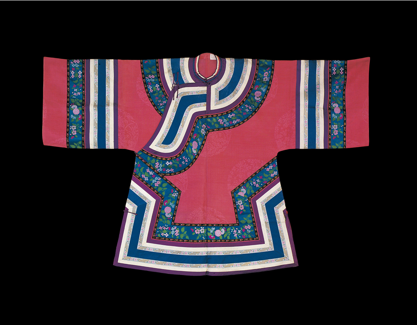 元代,作為民族大融合和中外文化大交流時期,長衣統(tǒng)稱為袍,其樣式南北方差異不大,但材料貴賤精粗,卻差距懸殊。漢族男性發(fā)式變化不多,但北方的漢族女性發(fā)式較前簡化。在元朝并沒有完整的冠服制度。蒙古人入主中原后仍保持其生活習俗,但同時又受漢族的影響,服飾日趨華麗。在大宴活動中,天子百官要穿統(tǒng)一顏色的服裝,稱為“質孫服”,其形為袍襖狀,與漢族深衣相近(圖為漢族清代牡丹紋緞繡女裝,中央民族大學民族博物館館藏)。