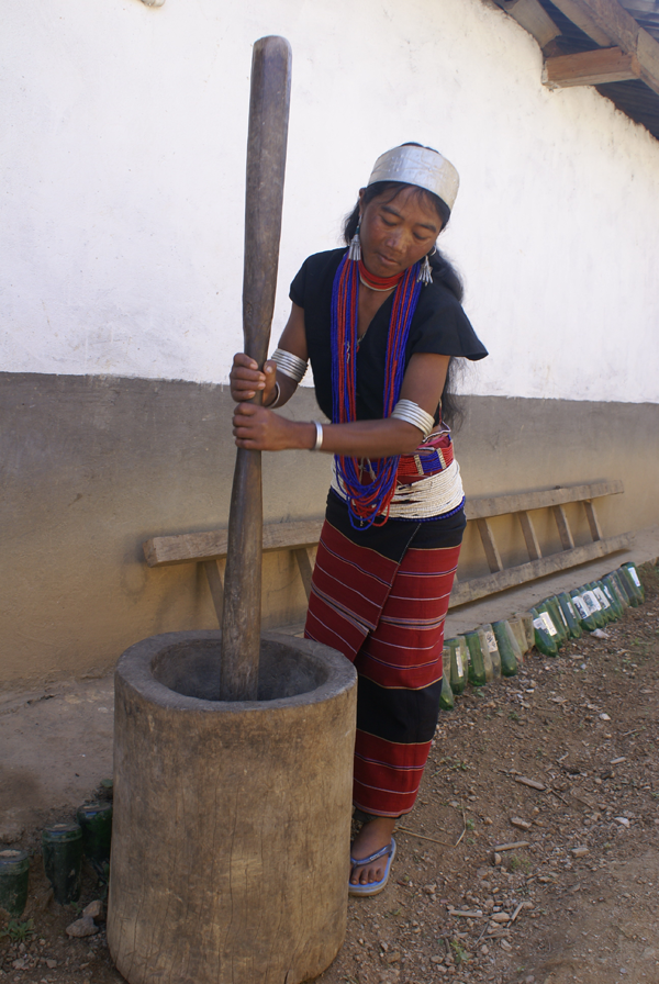 佤族以大米為主食。西盟地區(qū)的佤族都喜歡把菜、鹽、米一鍋煮成較稠的爛飯。其他地區(qū)的佤族則多吃干飯。農(nóng)忙時(shí)日食三餐,平時(shí)吃二餐。雞肉粥如茶花稀飯是家常食品的上品。旱稻多現(xiàn)吃現(xiàn)舂,男女老幼皆食辣椒,民間有“無(wú)辣子吃不飽”之說(shuō)。副食是青菜類、瓜類、酸竹筍、鹽、辣椒、蔥、蒜等。肉食主要是牛、豬、雞、狗以及獵獲的獸、禽、松鼠、田鼠、魚、螺螄、螃蟹、蜂兒等。一些地區(qū)的佤族還有捕食昆蟲的習(xí)慣,更食用蛹、寄生于草木植物的紅毛蟲、掃把蟲和寄生于冬瓜樹的冬瓜蟲等十余種。一般是把可食的昆蟲與米一起煮成粥,加菜、鹽、拌辣椒,香辣可口(兩圖為舂米和舂米用具,劉軍攝影)。