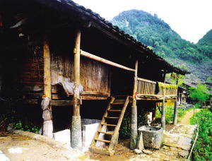 為適應(yīng)濕瘴環(huán)境,吊腳樓房屋兩層的較多,下層圈養(yǎng)家畜,堆放雜物,二層為居住生活層。前檐的4根立柱用圓柱形礎(chǔ)石支墊,這種石木結(jié)合,既古樸又穩(wěn)重。在廣西百色地區(qū)的那坡縣,世居著以黑為美的壯家人,因大山深處交通閉塞,至今傳統(tǒng)文化濃郁,成為廣西壯族自治區(qū)研究壯族文化的基地之一。