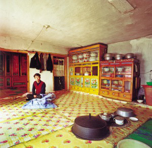 朝鮮族傳統(tǒng)住房不論什么結(jié)構(gòu),都是滿屋炕。進(jìn)屋脫鞋,席炕而坐是他們的習(xí)慣。房門的門檻很高,進(jìn)門是一塊一二平方米大小的屋地,接著是凹下去1米左右的燒火坑,里面是灶膛,放燒柴,平時(shí)蓋著木板,或添足燒柴坐在上面炊事。這樣,蓋板、灶臺(tái)、炕面在同一平面,像延伸了的火炕,既干凈又防火。因房屋較矮,又有大面積的火炕,加上明亮的玻璃窗,在