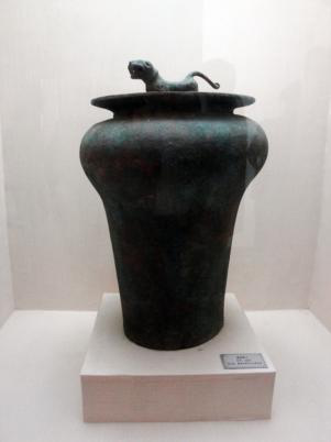 為巴文化最具代表性的青銅樂器,高68cm,上徑36cm,底徑28cm,重30公斤。1989年夏,萬州甘寧鄉(xiāng)發(fā)大水,錞于從紅旗水庫泄洪道巨石縫中被發(fā)現(xiàn),由萬州博物館收藏。2005年6月,調(diào)集到重慶中國三峽博物館。這件錞于屬戰(zhàn)國晚期的巴人作品,其通體完整,音質(zhì)優(yōu)良,造型厚重,形體特大,有“錞于王”之譽。其上部的鈕作虎形,栩栩如生,不怒而威,虎腿以漩紋勾畫出神物特征,是巴人虎崇拜的又一重要例證?;⑩o的周圍,分布著五組“圖語”:椎髻人面、羽人擊鼓與獨木舟、魚與勾連云紋、手心紋、神鳥與四蒂紋。這些圖語對研究巴文化是極為重要的資料,其中羽人擊鼓與獨木舟已經(jīng)被選取為重慶中國三峽博物館外墻浮雕的中心圖案(戰(zhàn)國青銅虎鈕錞于圖片由老鐵提供)。