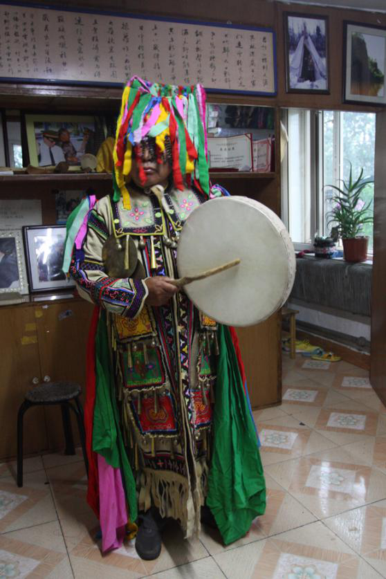 冬天穿的鞋是“奇哈密”和“溫得”,“奇哈密”是用狍脖皮或犴皮做靴底,用狍腿皮拼縫成靿的短靴?!皽氐谩笔怯寐够蜥砥ぷ龅?,鹿或犴腿皮拼縫成靿的長(zhǎng)靴?!皽氐谩币?yàn)殪壐?,冬天穿著打獵不易灌雪。這兩種靴子都要用冬季絨毛狍皮做成的襪子配套穿用,暖和跟腳,踩在雪地上沒(méi)有聲響。夏天一般穿“奧勞其”,是一種皮底布靿短靴。“考呼落”,是用冬季絨毛狍皮縫制的二指手套,掌面腕部留一縫口,手從縫口中伸出,手套仍護(hù)在手背上,既使在零下40度的嚴(yán)寒中處理獵物,也不用擔(dān)心手被凍壞。還有一種五指狍皮手套,背面正中繡花、蝶等中心圖案,五指的關(guān)節(jié)和指甲處繡出各種小型圖案,然后用連理枝將中心圖案和關(guān)節(jié)、指甲圖案連為一體,中心圖案代表手掌,手指圖案代表關(guān)節(jié)和指甲,連理枝代表骨骼和血脈(圖為越來(lái)越鮮見(jiàn)的薩滿服飾,吳雅芝供圖)。