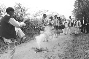 第二天一早,八音隊在前面邊走邊吹長調曲,由8人組成的迎親隊伍一路歡歌笑語地來到新娘家村口。八音隊要猛吹迎親曲,新娘家的人才出來迎接。這時,村里的一位長者拿著一把稻草、少許米飯、一個雞蛋,從村子走出來并緩緩點燃稻草,一邊念咒語,一邊向火堆拋雞蛋。然后,迎親隊伍走過火堆才能進村。