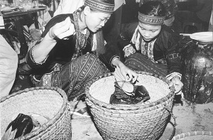 按照黎家人的規(guī)矩,“提親”是由男方家人請族內的一位親嫂嫂當媒人,帶著檳榔、簍葉、煙絲到女方家。如女方本人及家人樂意接受禮品,說明親事已定下來了。