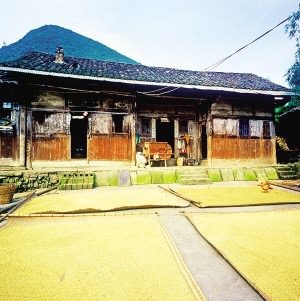 石阡花橋一帶的農(nóng)村,棟棟小樓飛檐翹角,竹木掩映,秀麗迷人。這些仡佬族民居都不太大,但出檐很深,檐下空間成為開放式倉庫,秋收時節(jié),家家戶戶的檐下掛滿金燦燦的包谷、紅艷艷的辣椒,一派豐收景象。民居平面呈曲尺形,正屋是四榀(一個屋架叫一榀)三間,明間有“吞口”。正屋一側加建廂房,飛檐翹角小巧玲瓏。廂房都是兩屋,而且多為吊腳。底屋關牲口,堆柴草,放農(nóng)具。樓上環(huán)以直欞欄干,檐下曬衣物。飛檐翹角不僅美觀,而且對增加室內(nèi)采光和室外使用空間有重要作用。這種翹角樓的封檐板刷上石灰,分外醒目。逢年過節(jié),門窗、立柱遍貼對聯(lián),喜慶氣氛更為熱烈。
