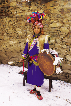 “釋比”是羌族對(duì)宗教儀式執(zhí)行者的尊稱,漢語(yǔ)稱之為“端公”,是羌族文化知識(shí)的集大成者。釋比頭戴的猴皮帽和手中的羊皮鼓現(xiàn)在已成為珍貴的民族文物