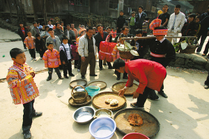 我們尾隨著娶親隊伍進寨,發(fā)現(xiàn)寨子中間的路上也擺著很多簸箕、臉盆之類的容器,原來,村民們也要“討賞”呢!聽高邦寨的村支書說,遇到這種情況,路人放的東西越貴重,娶親隊伍留下的肉食就越豐盛,有時甚至?xí)畔乱徽浑u或鴨呢!