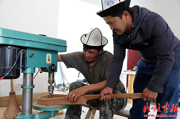 這間工作室的主人叫阿吉?jiǎng)e克·買買達(dá)洪,主人恰巧有事外出,他的弟弟,年輕朝氣的吾蘭別克張羅著給記者們當(dāng)起了翻譯。正忙活著打磨樂器的小伙叫木沙,今年31歲,問起庫姆孜的制作工藝,他才把頭抬起來,笑著說:“我做這個(gè)十年了。一把庫姆孜,往往琴身是杏木,蓋子是松木。杏樹、松樹木切割后放在干燥的地方,一兩年后才能用?!睅炷纷斡腥?,琴弦以前用動物的腸子手工自制,現(xiàn)在有的工匠開始使用現(xiàn)成的弦。判斷庫姆孜手工藝人手藝高低的關(guān)鍵何在?木沙解釋說,“要看彈出來的聲音。木頭的原料不同,出來的聲音也不同?!边@個(gè)回答似乎也隱藏了手工藝人的絕活所在,可意會不可言傳的技藝,往往在一代代的工匠手中以師徒親授的方式傳承。