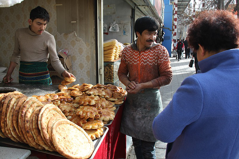 他們的住處是一棟老樓,沒(méi)有電梯,也沒(méi)有廊燈,買(mǎi)麥提·沙烏提打開(kāi)手機(jī)照明,帶著我走進(jìn)了樓上的家。10平米左右的小屋里放了兩張雙人床,沒(méi)有家俱,這間月租600元的房間就是三個(gè)伙伴的住處。41歲的伊力江·吐地年紀(jì)最大,大家都叫他艾尼。艾尼妻子的哥哥是小店的老板,10年前來(lái)到這里,在城里安了家。三人都是打工者,每月3000元工資。每天早上7點(diǎn)出來(lái),中午不休息,一直干到晚上9點(diǎn)半,每人每月可以在周日輪休一天。他們的家鄉(xiāng),遠(yuǎn)在新疆阿克陶縣加馬鐵克鄉(xiāng)巴格拉村。古爾邦節(jié)、開(kāi)齋節(jié)時(shí),大家坐火車(chē)回家過(guò)節(jié)。